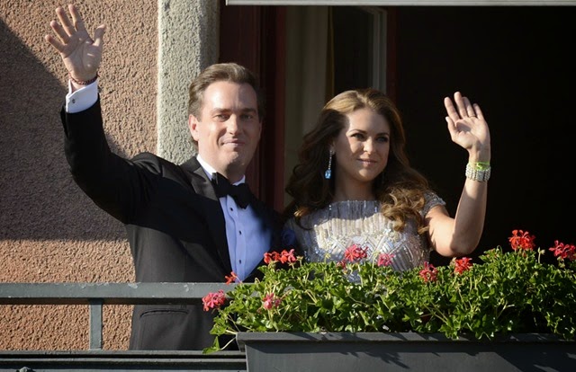 Los novios salieron a saludar desde uno de los balcones del hotel a los numerosos ciudadanos que se acercaron a los alrededores para mostrarles su cariño y además ver en directo el desfile de elegancia por la alfombra roja de todos los invitados. La Familia Real y la familia de Christopher O'Neill en la cena en el Grand Hôtel.